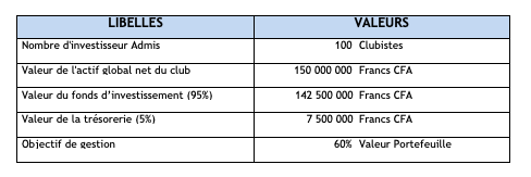Ainsi, la survenance de l’un de ces risques peut entraîner une baisse de la valeur liquidative du portefeuille. Cependant, l’actif du club étant investi sur les recommandations et la supervision du Cabinet AGIOS Expertise & Finance, ces différents risques sont jugulés par l’intervention de plusieurs professionnels du secteur.