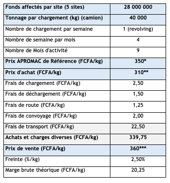 ** Le prix d’achat bord champ varie en fonction des zones géographiques d’achats et se situe actuellement autour de « Prix APROMAC minoré de 40 FCFA ».